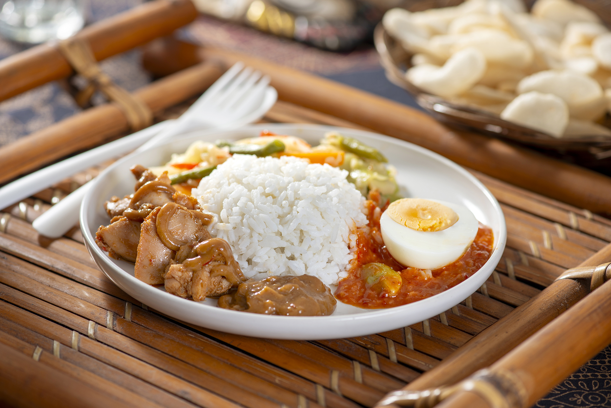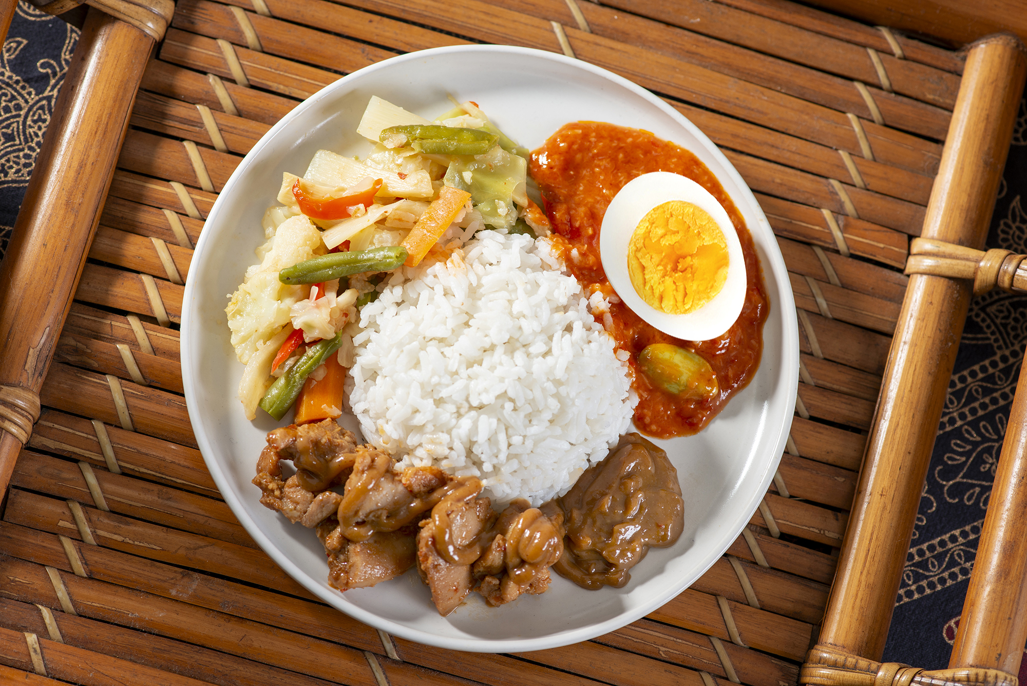 Voorheen bekend als de Blauwe Hap. Witte rijst, knapperige groenten, ei in chili kokossaus en malse gemarineerde kipdijfilet in satehsaus.